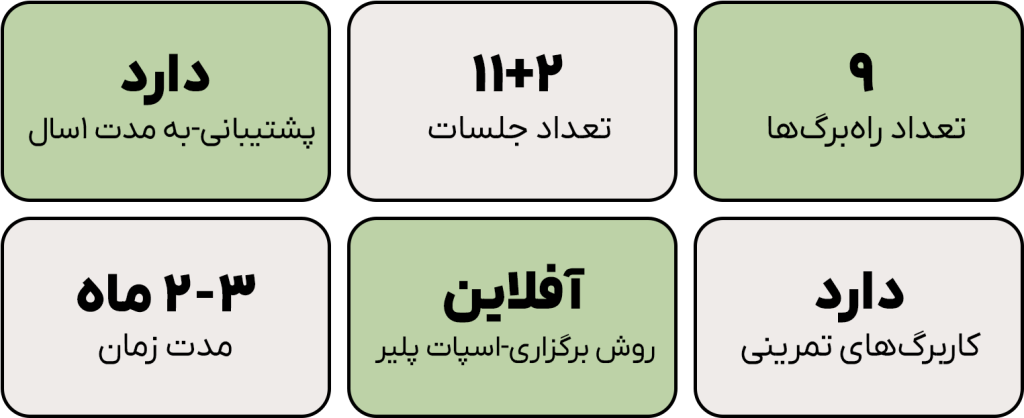 برنامهریزیش کاملا دست خودتونه. شما میتونید هفتهای یک راهبرگ و جلسه رو ببینید که هر راهبرگ به صورت میانگین 1 ساعته و بعد در طول هفته مثلا روزانه نیم ساعت زمان بذارید و کاربرگ تمرینی و تمارین رو کامل کنید و به این شکل قدم به قدم پیش برید. یا میتونید با توجه به شرایطتون برنامه فشردهتری رو در نظر بگیرید.