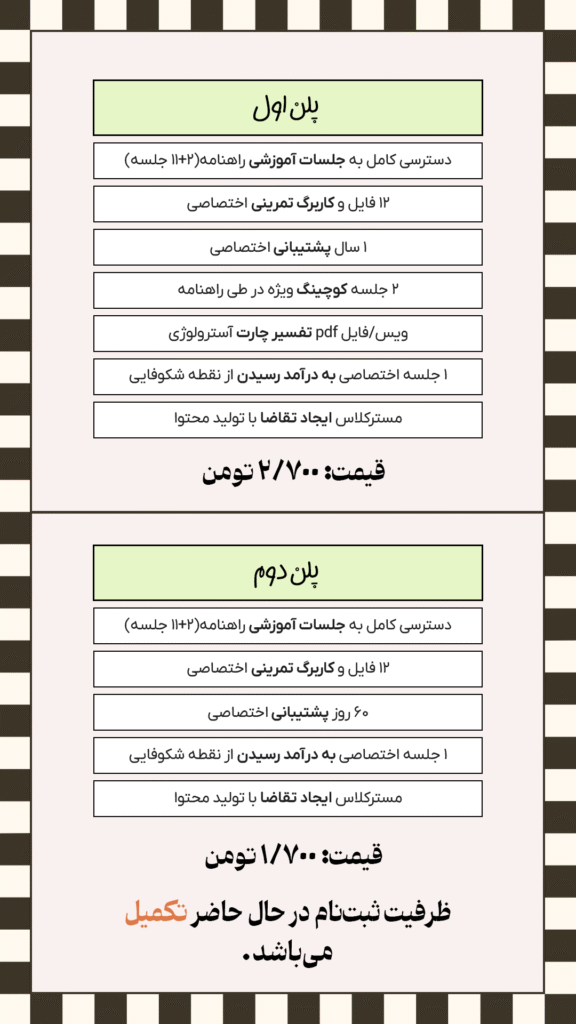 پینوشت دوم: هزینهٔ تفسیر چارت تولد بسیار بالاست و آسترولوژرهای مختلف، هزینههای متفاوتی رو برای اون درنظر میگیرن. منتهی چون این مسیر کمککنندهٔ تکمیلی برای نقطهٔ شکوفایی شماست، اینکار فعلا به صورت کاملا دلی و بدون دریافت هیچگونه هزینهای برای شما انجام میشه تا روشنیبخشِ بیشتر مسیرتون باشه.